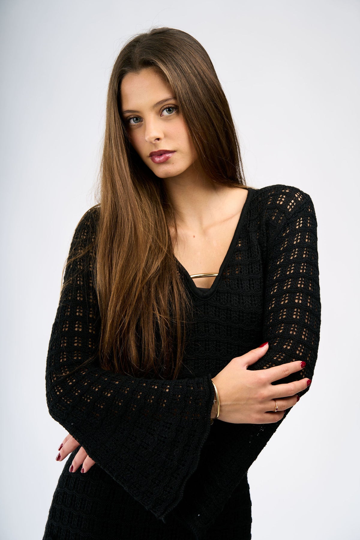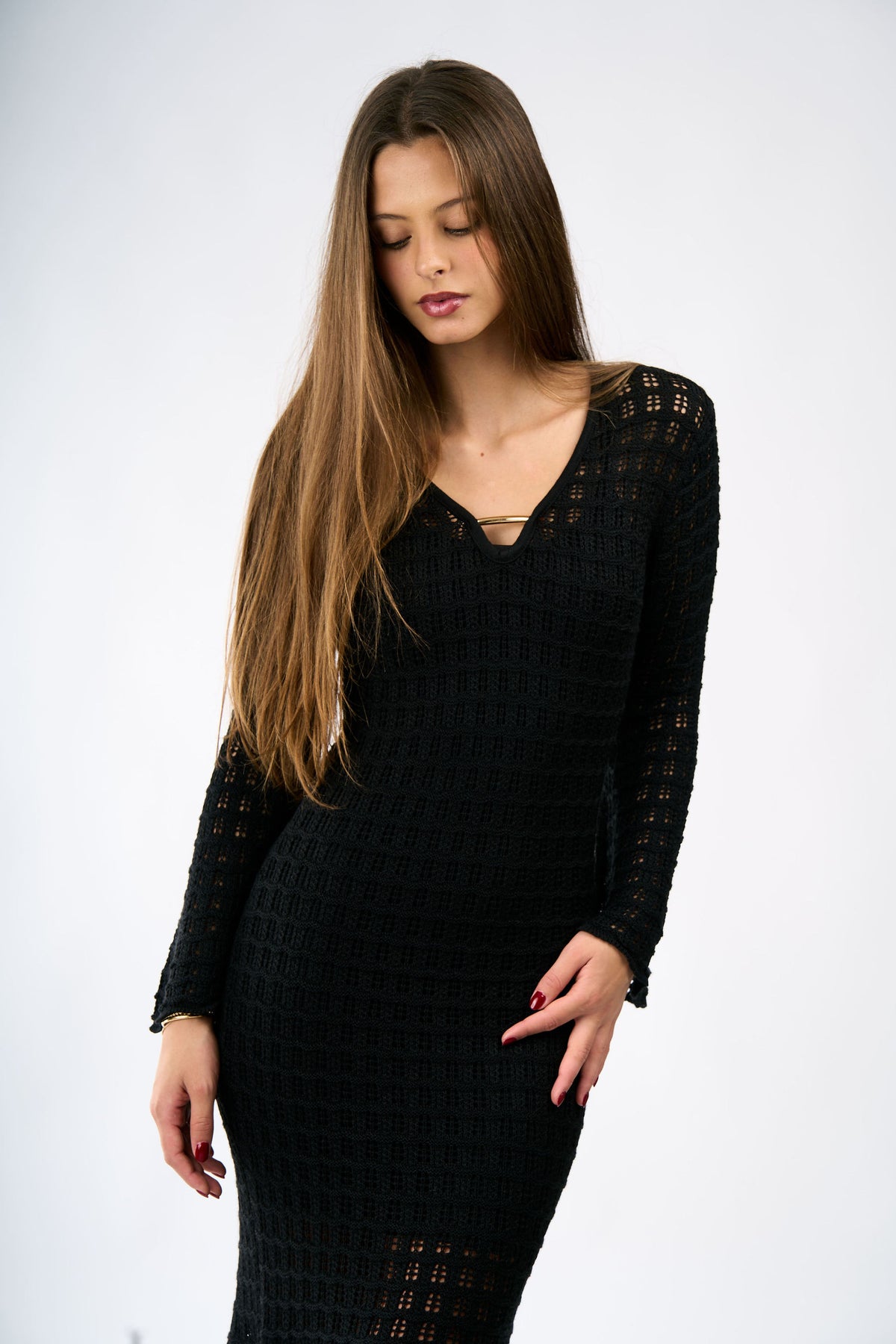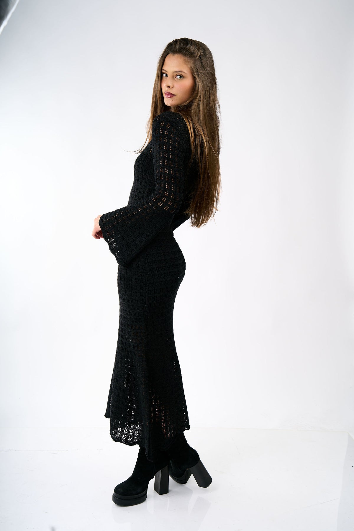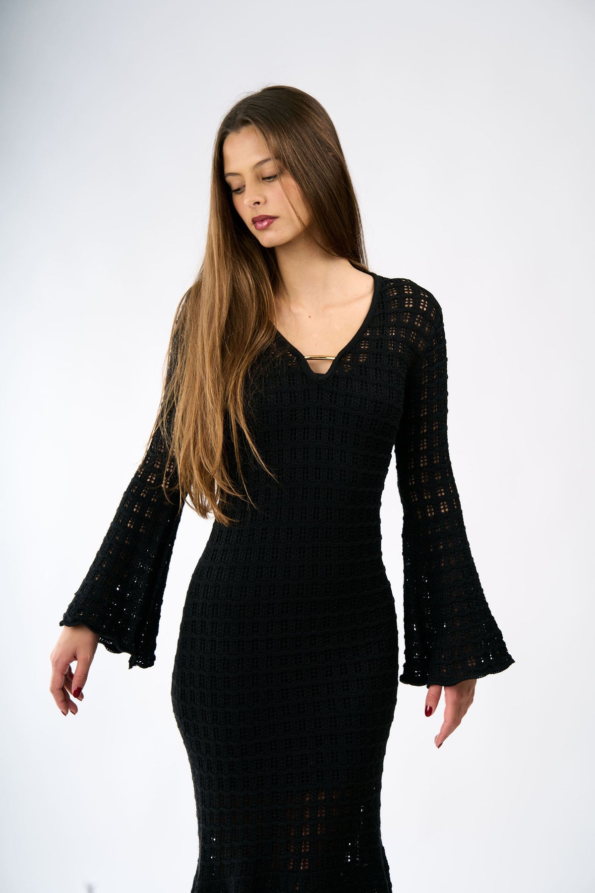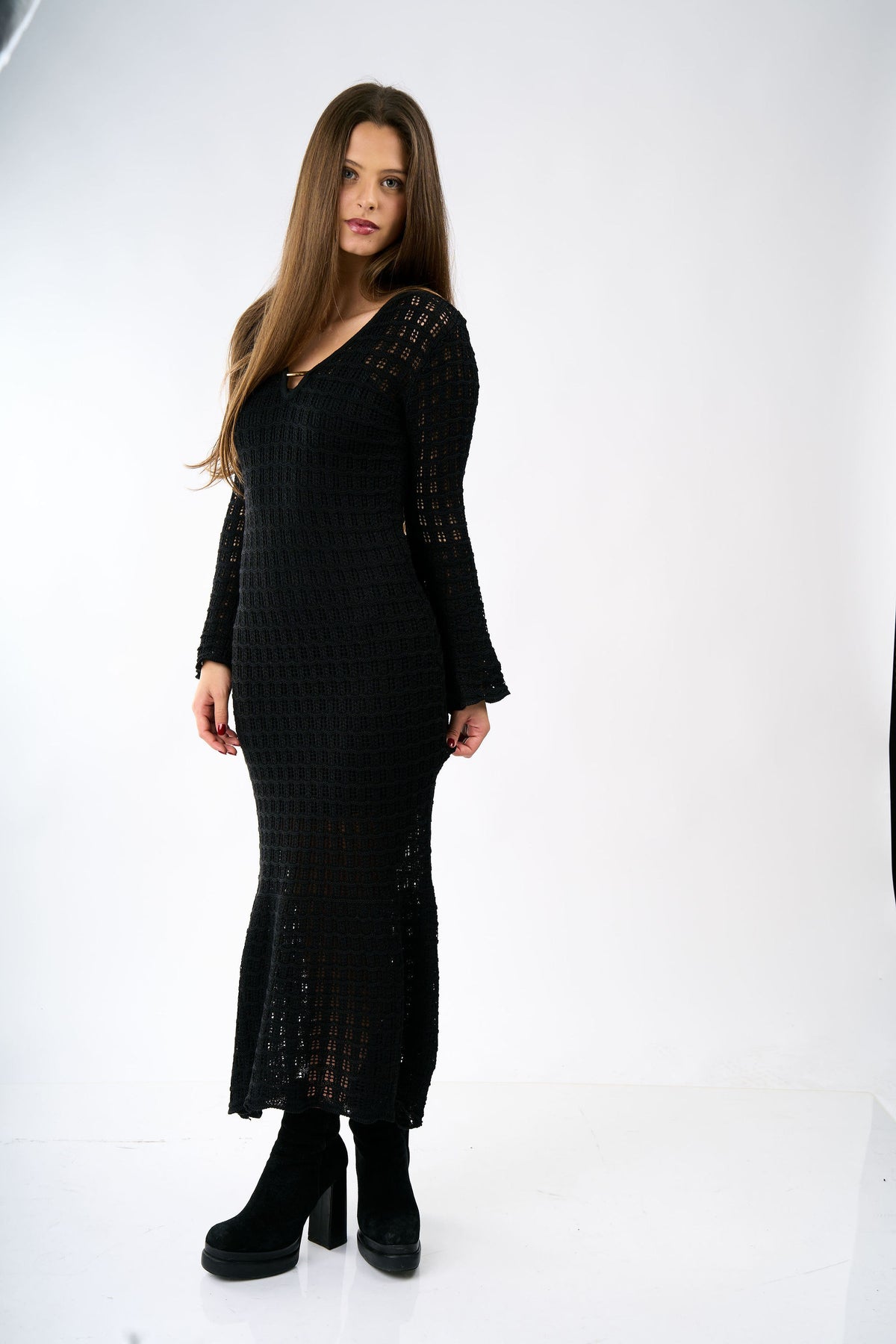 The Amelia dress in black, one size. Versatile and elegant design that adapts to different body types, perfect for wearing over your bikini at the beach or pool.